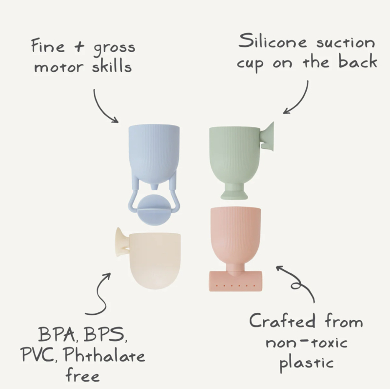 Artikelnummer: 70.077.70 OverzichtMaak van badtijd een boeiend avontuur met onze giet- en speelset voor in bad, perfect voor kleine handjes en nieuwsgierige geesten. Elk kopje heeft een siliconen zuignap aan de achterkant, waardoor je creatieve opstellingen op de badwanden kunt maken om een betoverend watervaleffect te creëren. Met verschillende openingen aan de onderkant voor unieke waterstromingspatronen en één speciaal gietkopje stimuleert deze set fantasierijk spelen en zintuiglijke verkenning.