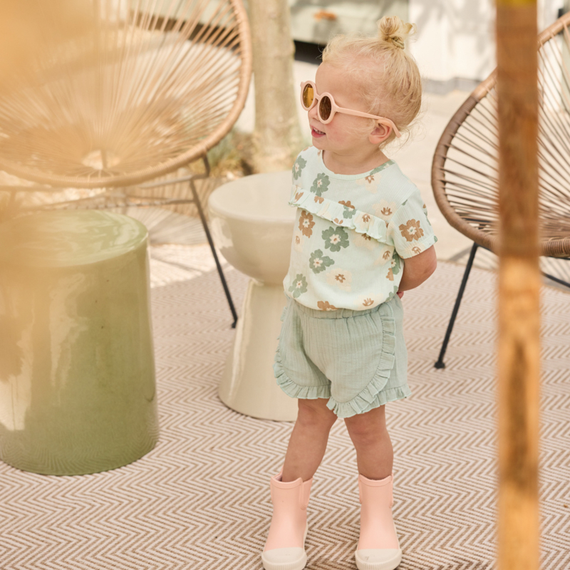 Artikelnummer: N58395-35 OverzichtBloemetjes all-over zorgen voor een lieve en vrolijke look. Dit Dirkje T-shirt met korte mouwen is gemaakt van katoen met stretch en heeft een speels structuurtje in de stof. De lichtgroene meisjes top is voorzien van ruffles op de voorzijde en een vrolijke bloemenprint in zachte tinten, waardoor het een zomerse en stijlvolle toevoeging is aan de garderobe van je kleintje.