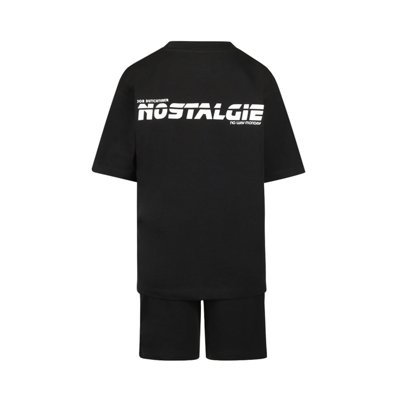 Het shirt met korte mouwen heeft een comfortabele loose fit. Op de voorkant vind je een kleine witte Job Dutchtuber print, terwijl de achterkant indruk maakt met een grote witte "Nostalgie" print. Ook de shorts zijn voorzien van een kleine Nostalgie opdruk, wat de set een herkenbaar en exclusief karakter geeft.