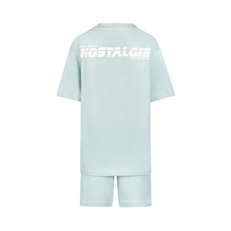 Zowel het shirt als de shorts zijn uitgevoerd in de kleur Ether. Op de voorkant van het shirt vind je een kleine witte Job Dutchtuber print en op de achterkant een grote witte Nostalgie print. De shorts zijn afgewerkt met een kleine nostalgie opdruk, wat zorgt voor een stoere, maar rustige look. Een complete set met herkenbare details voor de echte fan.