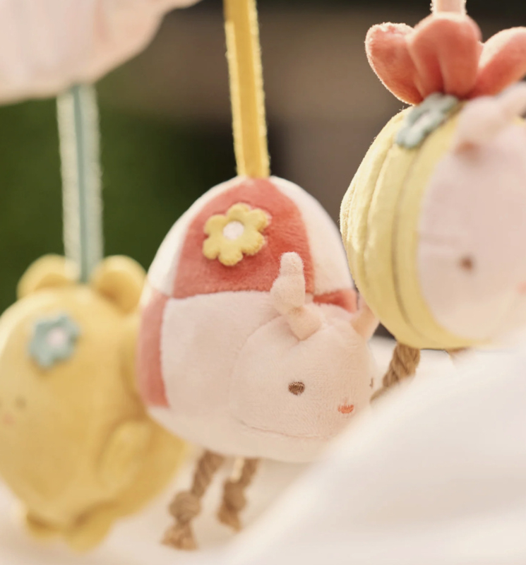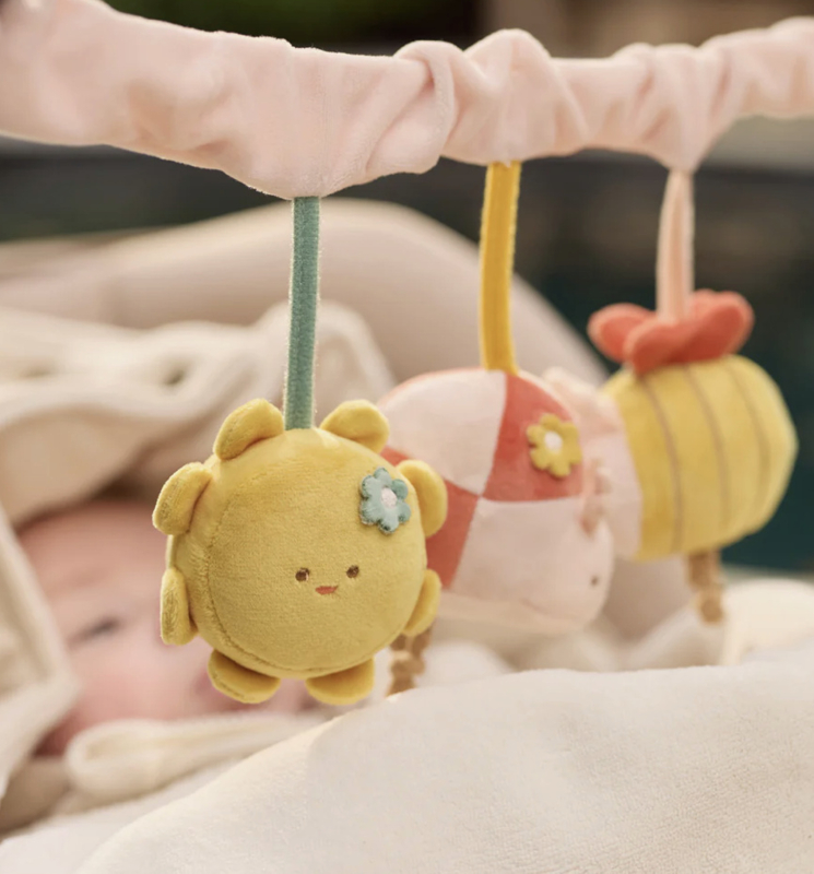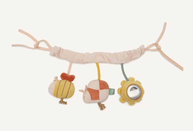Deze vrolijke wagenspanner uit het Pretty Picnic thema is het perfecte speeltje voor onderweg. Het zonnetje heeft een spiegeltje waarin je kleintje zichzelf kan ontdekken, het bijtje maakt een knisperend geluid en het lieveheersbeestje heeft een zacht belletje binnenin. Samen zorgen ze voor eindeloos kijk- en speelplezier onderweg!