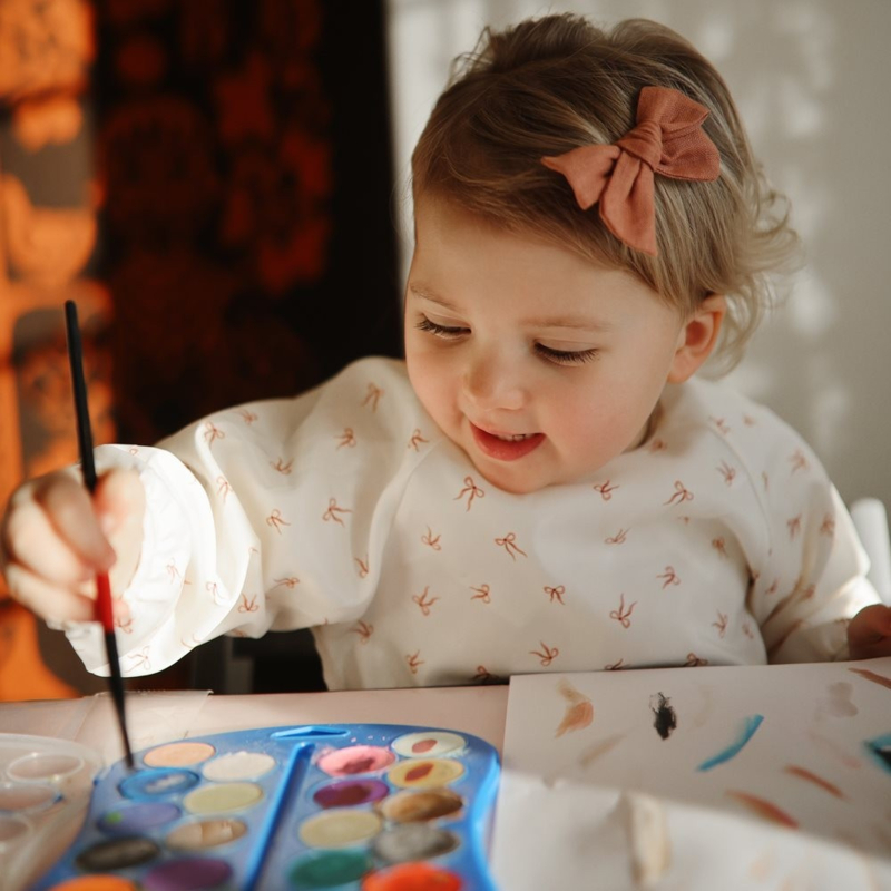 Houd de kinderen schoon tijdens het eten, tijdens het knutselen of op andere rommelige momenten met het waterbestendige slabbetje met lange mouwen van Mushie.