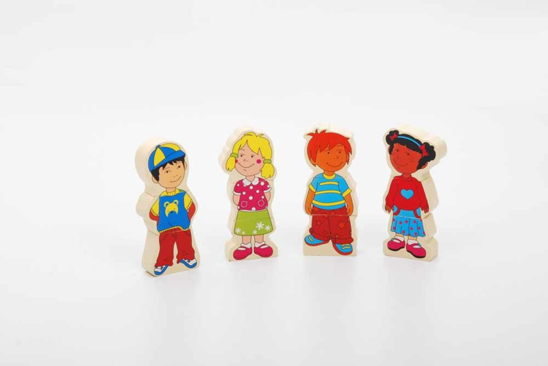 12 houten blokken, aan beide zijden bedrukt, 4 jongens en 4 meisjes, ieder kind bestaat uit 3 delen, zodat in totaal 8 verschillende kinderen te maken zijn.