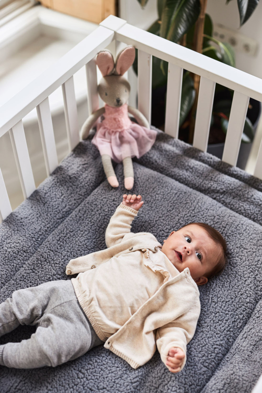 Zacht en aaibaar boxkleed met teddy van Jollein. Het boxkleed is gemaakt van teddy (polyester) en gevoerd met fiberfill. De afmeting is 80x100 cm en het boxkleed is verkrijgbaar in cream white en grijs.