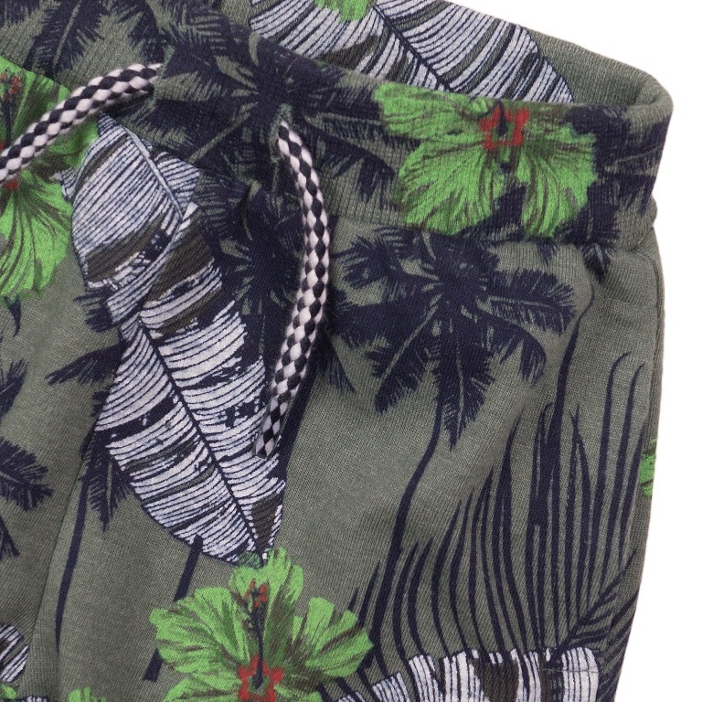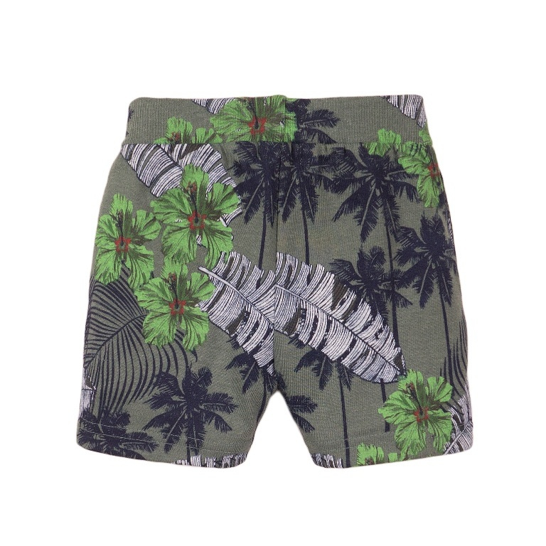 Artikelnummer: E38575 OverzichtDeze faded groene Dirkje jongens short is van een zachte stof. De korte broek heeft een all-over print van palmbladeren en bloemen in de kleuren blauw, wit en fel groen. Het shortje is afgewerkt met een sierkoordje.