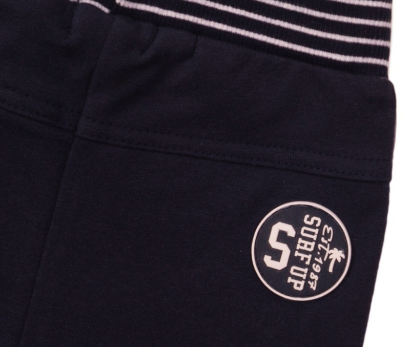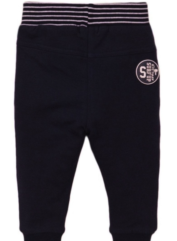 Dit blauwe Dirkje jongens broekje is van een zachte katoen. Het donkerblauwe broekje heeft een blauw wit gestreepte band in de taille. De jogging broek is afgewerkt met een siertouwtje en steekzakjes.