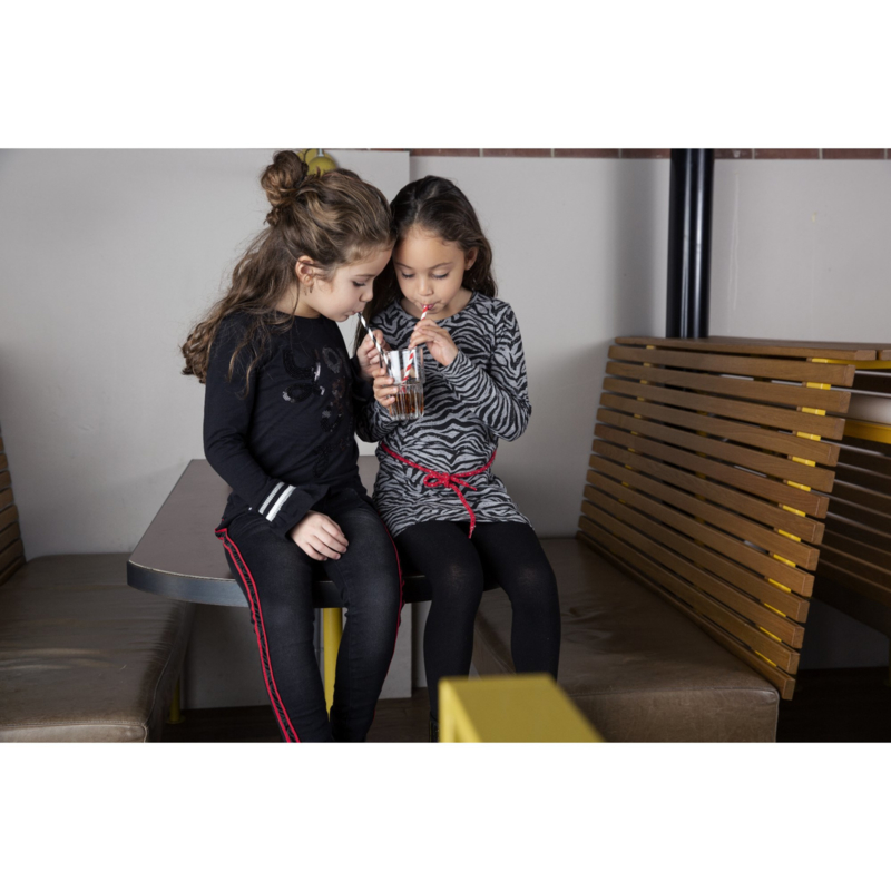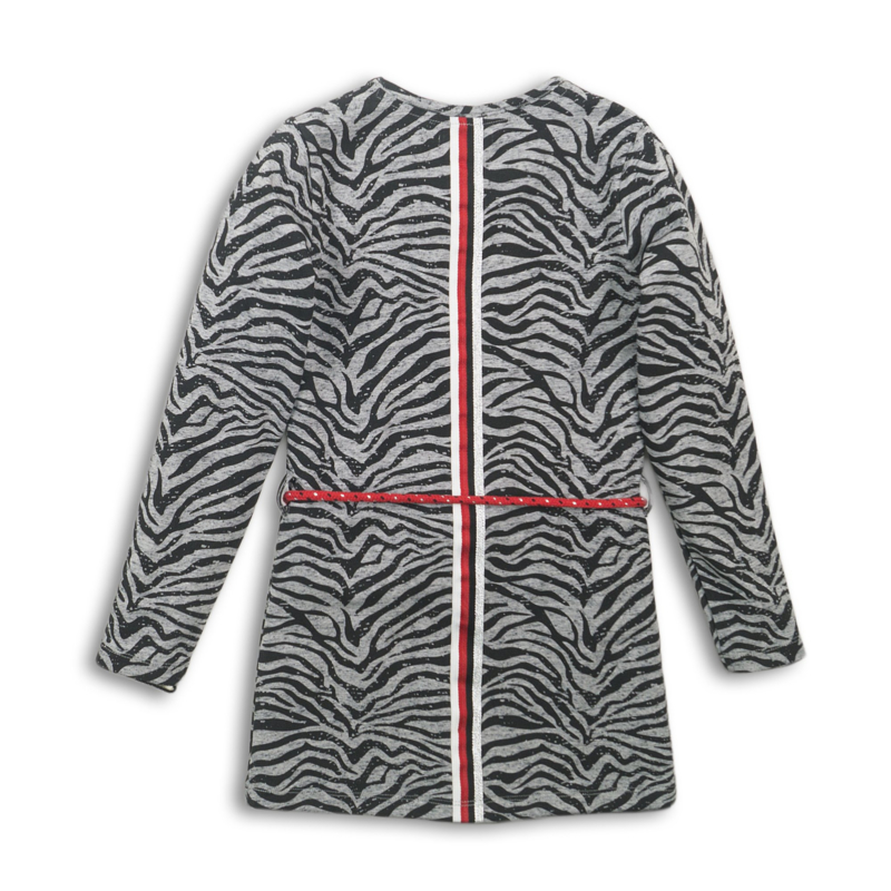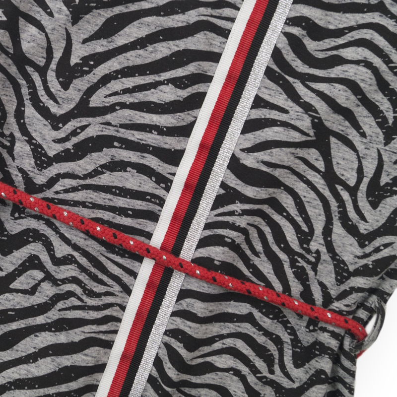 De jurk in zebrastyle wordt afgemaakt met een rood koord voor om het middel en een rode stripe op de rug.