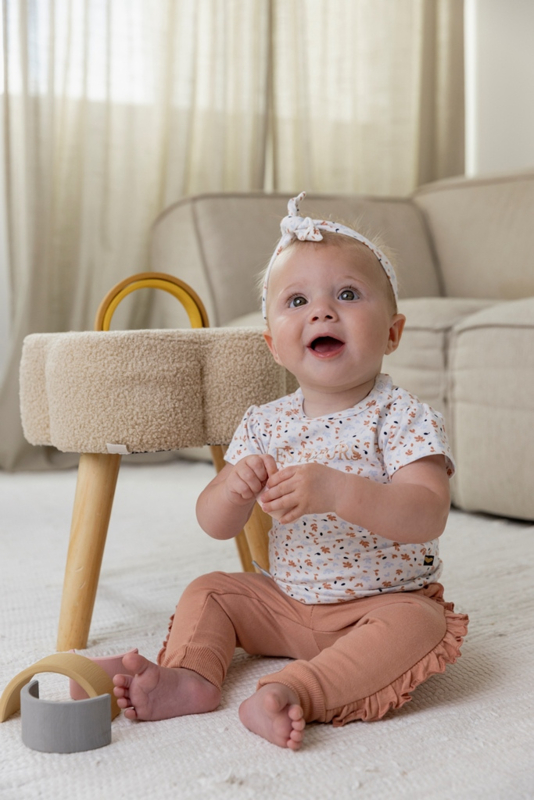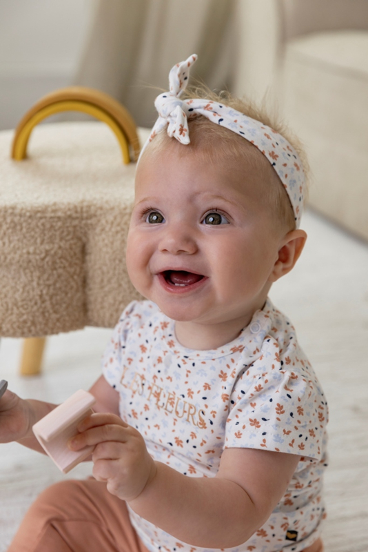 Artikelnummer: T46345 OverzichtDit witte Dirkje meisjes shirtje met korte mouw heeft lieve plooitjes op de mouwkop. Het T-shirt van katoen heeft een all-over print van oudroze en lichtblauwe blaadjes. De bijpassende haarband is van dezelfde stof.