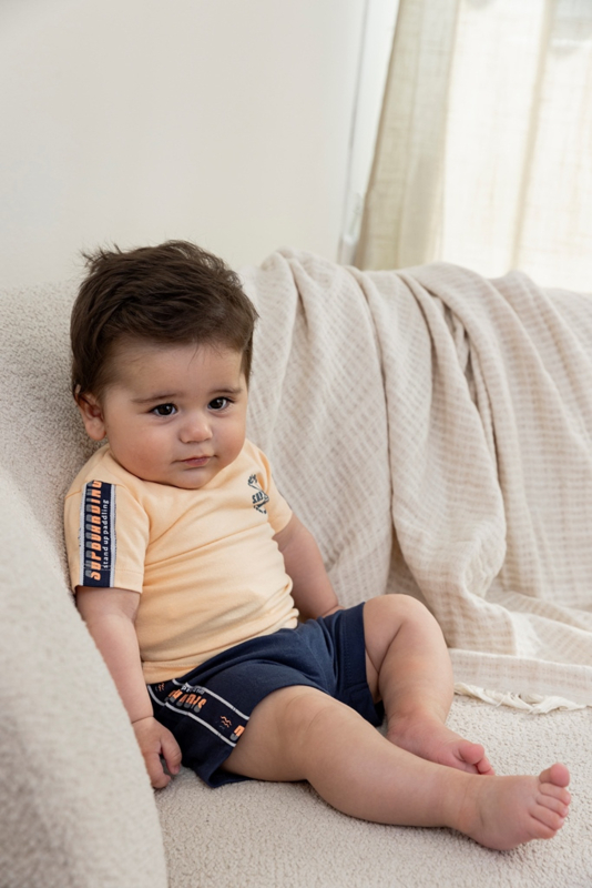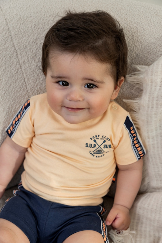 Artikelnummer: T46636-31 OverzichtDe Dirkje baby jongens 2-delige set van T-shirt met short is van zachte katoen. Het zacht oranje shirtje met korte mouw heeft donkerblauwe banen over de mouw. De jersey korte broek in donkerblauw heeft een blauwe baan over de mouw. De jersey korte broek in donkerblauw heeft een blauwe baan opzij met tekst in peach.