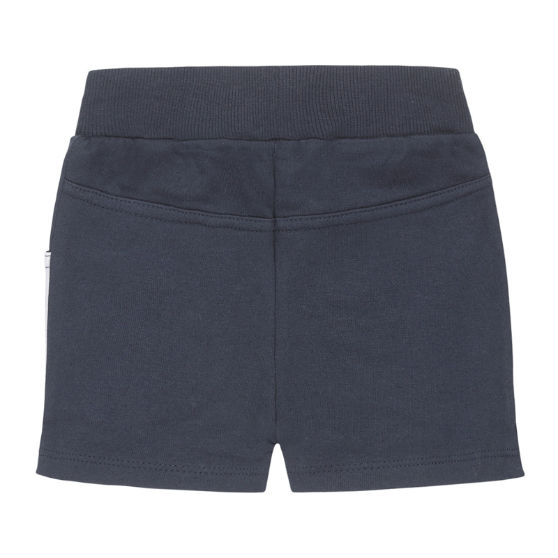 Artikelnummer: T46656-35 OverzichtDirkje jongens jogging short donkerblauw. Deze sportieve korte broek van zacht katoen is voorzien van sierkoordjes in de band en steekzakjes. Leuk detail van deze sweatshort is de wit gestreepte baan over de zijkant van het been.