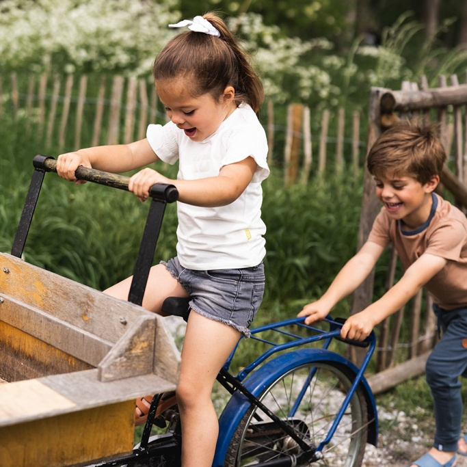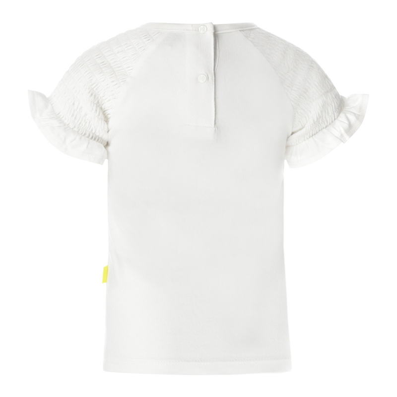 Koko Noko meisjes T-shirt off white. Dit shirt met korte mouwen heeft een mooie boothals voorzien van een ruche. Het shirtje van een katoenen seersucker stof draagt heerlijk voor je hippe meisje in de zomer.