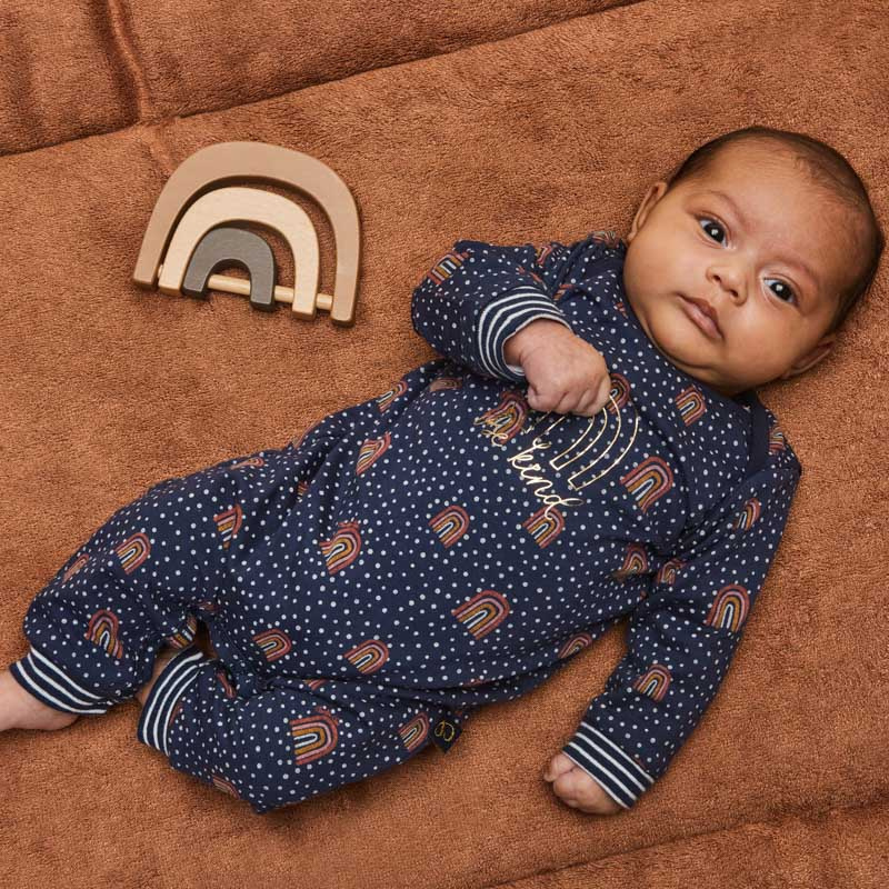 Artikelnummer: U45008-41 OverzichtHet donkerblauwe Charlie Choe baby meisejs boxpakje met de mooie print van regenbogen en stipjes is van zacht katoen en heerlijk voor je vrolijke meisje.