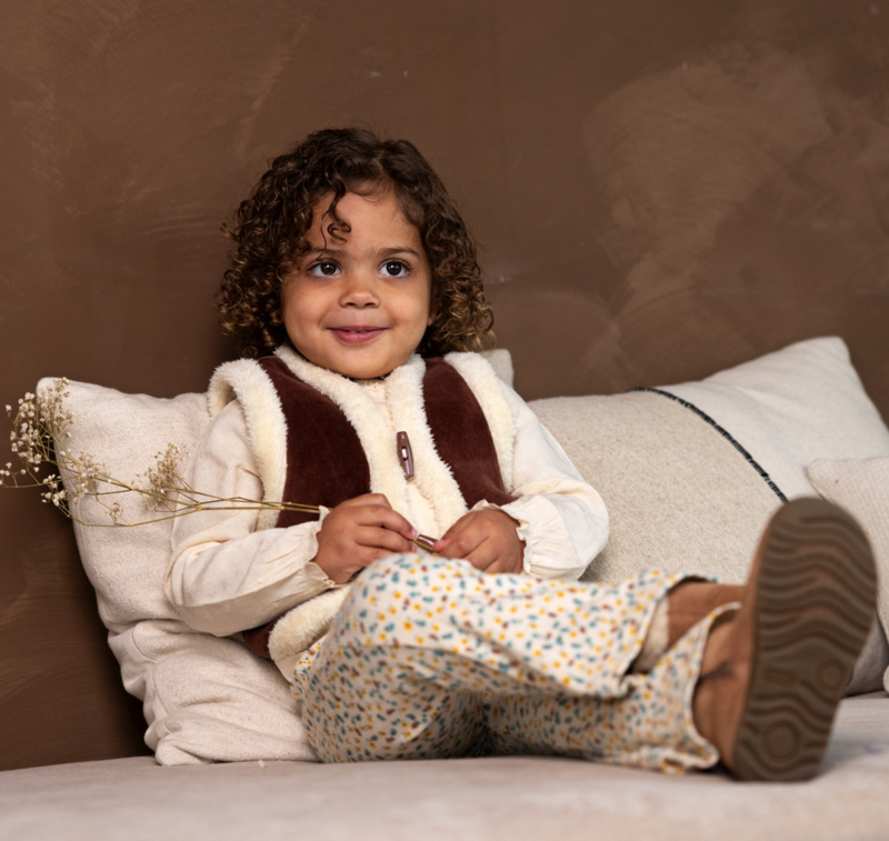 De kleding van Dirkje valt op maat. We raden aan om de maat te kiezen op basis van de lengte van je kind.