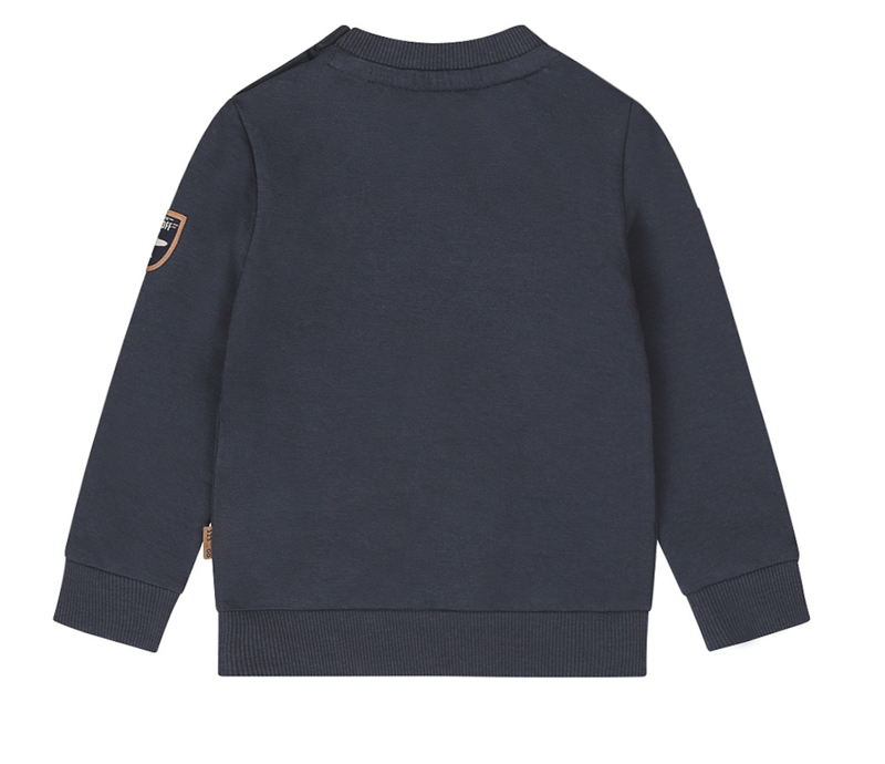 Artikelnummer: Q52733-35 OverzichtAre you ready for take-off?! Deze Dirkje sweater is donkerblauw en gemaakt van een zachte katoen met stretch, heerlijk comfortabel dus. De jongens trui heeft een mooie vliegtuig opdruk op de voorzijde en een leuke applicatie op de mouw. De maatjes tot en met 86 hebben drukkers op de schouder.