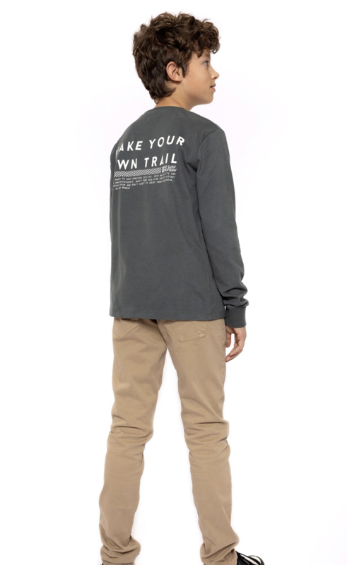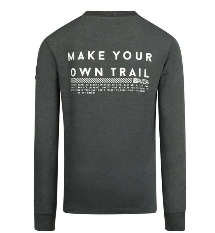 Artikelnummer: Q52216-1 OverzichtMake your own trail. De No Way Monday longsleeve in legergroen is gemaakt van een zachte katoen. Het jongens shirt met lange mouwen heeft een tekstopdruk en ritsje op de voorzijde, de achterzijde is voorzien van een stoere 'Make you own trail' opdruk.