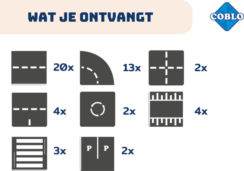 Als puzzelstukken koppelen kinderen de Coblo stenen met de verschillende baanonderdelen (kruispunten, rotondes, bochten, drempels en meer) aan elkaar en zo vormen ze iedere keer een nieuwe route om met hun autootjes overheen te crossen. Deze toppers maken de fantasiewereld van kinderen nog mooier en groter.