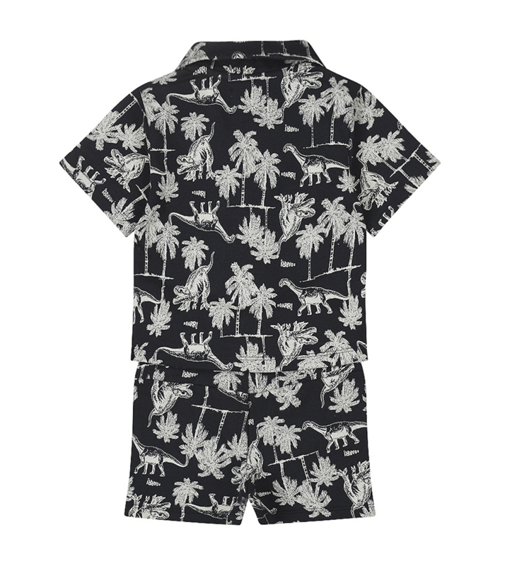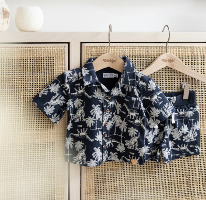 Artikelnummer: P54698-35 OverzichtKlaar voor zomerse avonturen met de Dirkje set in donkerblauw. Deze schattige zomerset voor jongens bestaat uit een blouse met korte mouwen en een bijpassend broekje, beide versierd met een speelse dino-print. De jongens blouse heeft een kraagje, een leuk borstzakje en een knoopsluiting, terwijl het comfy broekje dezelfde print en een elastische tailleband heeft. Gemaakt van een zachte katoen met stretch, biedt deze set ultiem comfort en stijl voor je kleintje, perfect voor zonnige dagen!