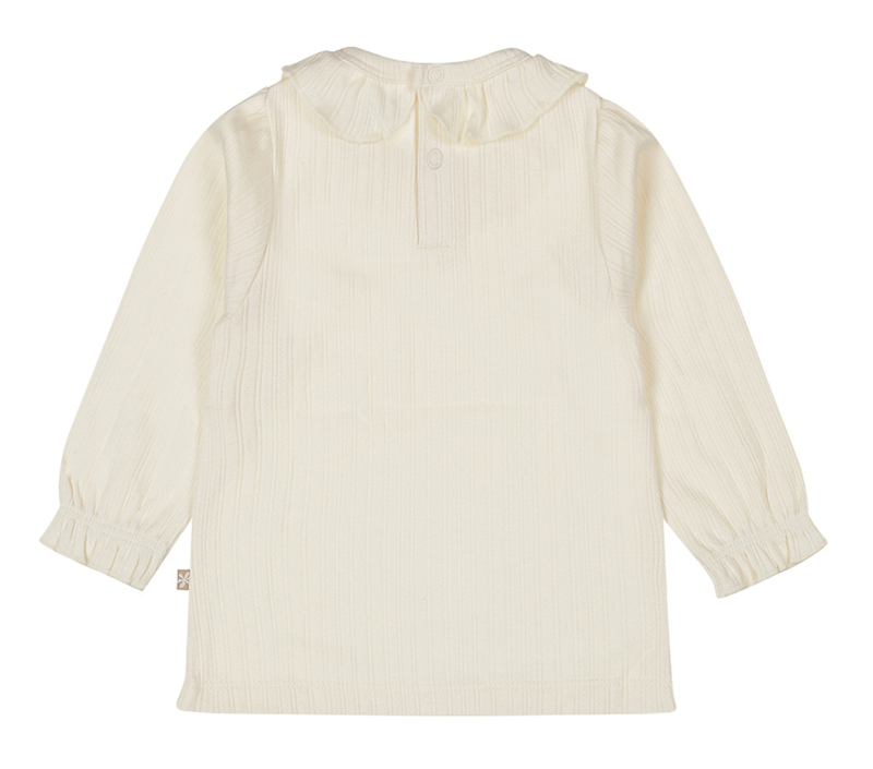 Artikelnummer: P54398-35 OverzichtDeze lieve Dirkje longsleeve in off white is een perfecte keuze voor elke dag. Gemaakt van 100% katoen, biedt de mooie ajourstof een ademende en comfortabele pasvorm voor je kleintje. Het meisjes shirt met lange mouwen is voorzien van een schattig kraagje en elastiek aan de mouwtjes, wat zorgt voor een speels en charmant detail. Ideaal om te combineren met andere kledingstukken voor een complete, schattige look.