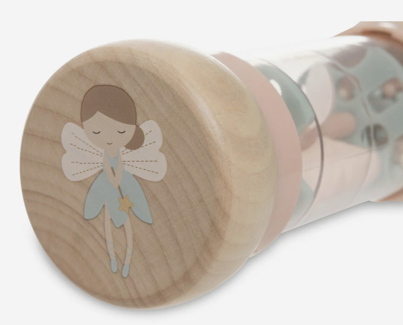 Artikelnummer: 039-001-67104 OverzichtBreng plezier en kleur in de wereld van je kleintje met onze vrolijke regenrammelaar! In de transparante koker zie je de gekleurde balletjes rondspringen, wat zorgt voor een heerlijk gerinkel en eindeloos vermaak. Bovenop schittert de schattige Fairy Amy, en onderop het lieve vogeltje uit het 'Lovely birds' thema. Een van de leukste items uit onze speelgoed collectie én mega leuk als kraamcadeautje!